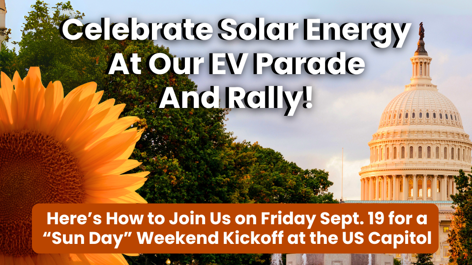 The weekend will kick off with an historic EV parade around the U.S. Capitol in Washington DC on Friday, September 19. Our plan is to have at least two dozen decorated EV cars, E-bikes, and E-scooters follow a pre-selected loop on the National Mall near the Capitol for at least 30 minutes with pro-solar messaging.